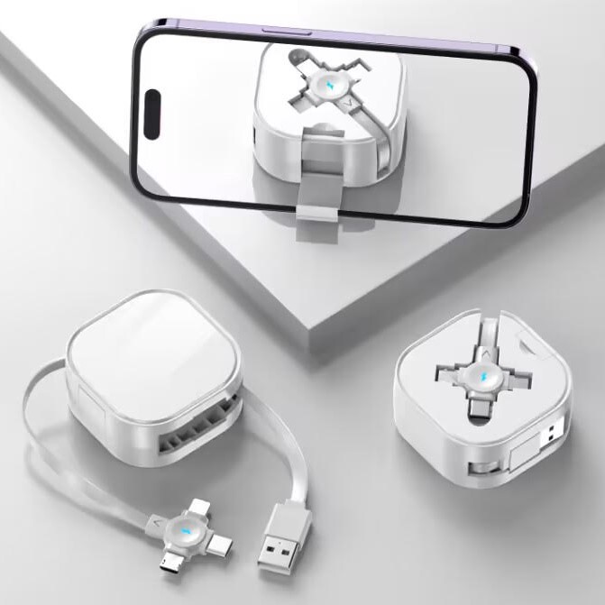 Simplifica tu día con el Cable Retráctil 4 en 1, diseñado para carga rápida, soporte móvil ajustable y portabilidad total.