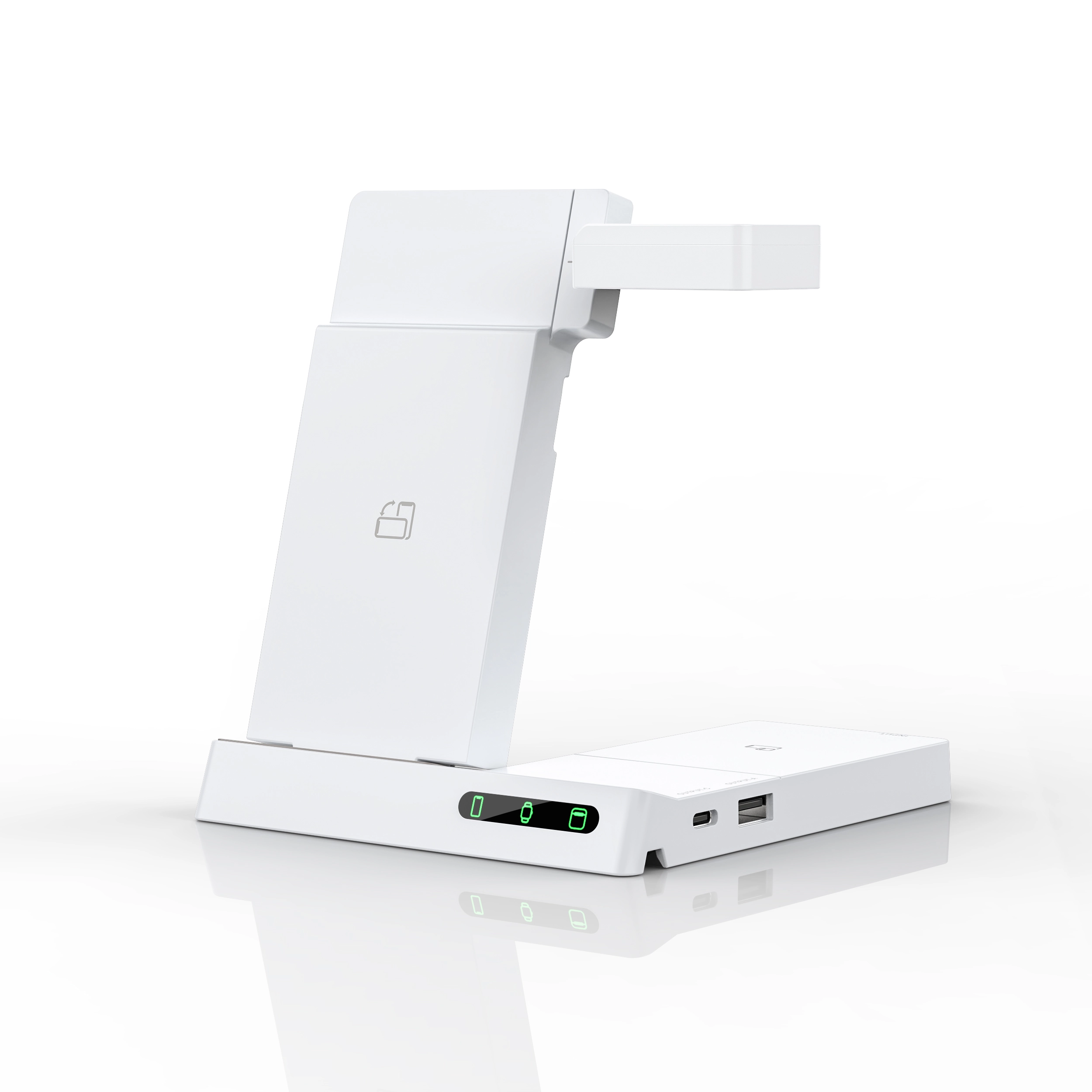 Permite cargar smartphones de forma inalámbrica en posición horizontal o inclinada, además de auriculares y relojes inteligentes Apple y Samsung, brindando comodidad, orden y eficiencia.
