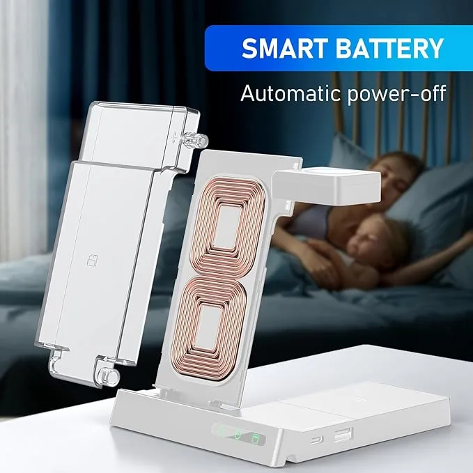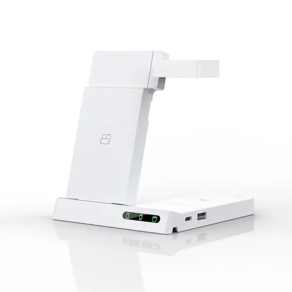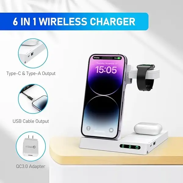 El cargador inalámbrico 6 en 1 (YF-6) es una solución práctica y elegante para mantener múltiples dispositivos cargados y organizados en un solo lugar. Su diseño plegable y modular permite adaptarlo según el uso o guardarlo fácilmente cuando no se utiliza, ideal para escritorios, oficinas y mesas de trabajo.