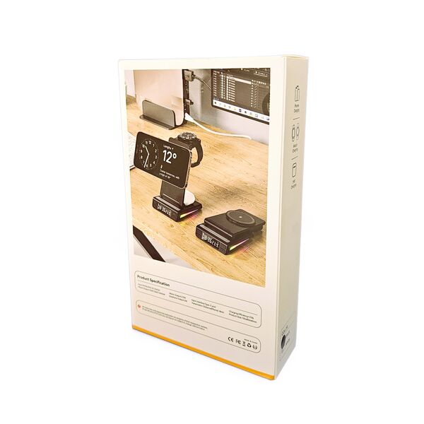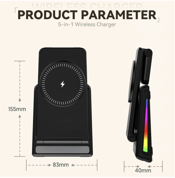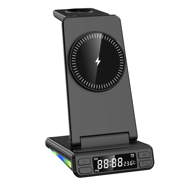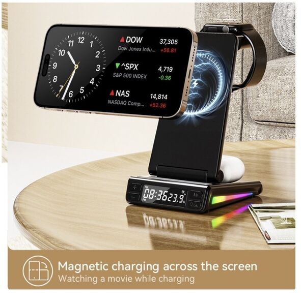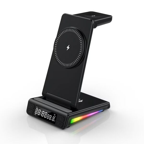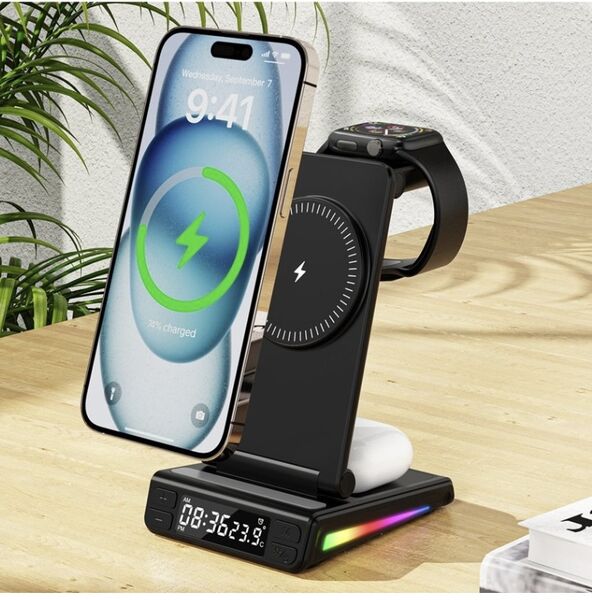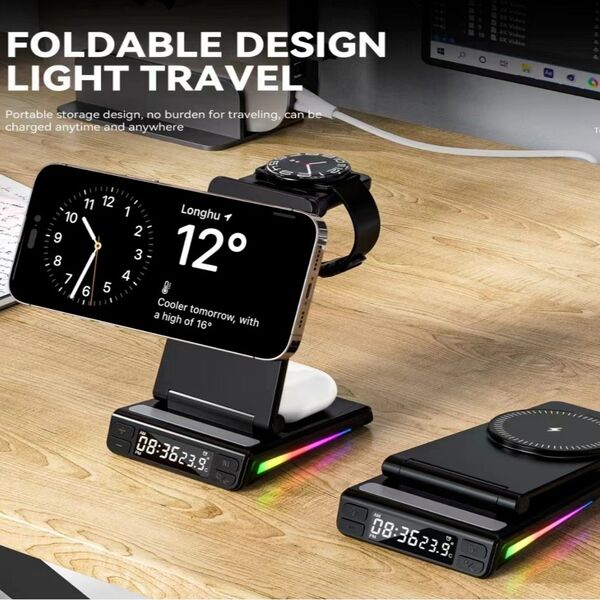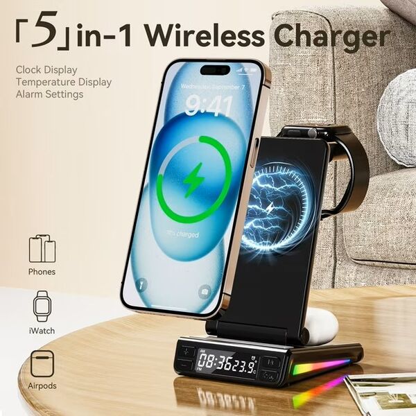 Estación de Carga Inalámbrica 5 en 1 MagSafe â Compatible con Relojes Samsung, Apple y MásOrganizá tu espacio y cargá todos tus dispositivos al mismo tiempo con esta estación de carga inalámbrica 5 en 1. Diseñada para ofrecer practicidad, diseño moderno y tecnologÃa inteligente, es ideal para el hogar, la oficina o tus viajes.Compatibilidad universal:Smartwatches con carga inalámbrica: Compatible con todos los modelos Samsung, Apple Watch y otras marcas.Auriculares TWS con carga inalámbrica: Totalmente compatibles.Smartphones con carga inalámbrica MagSafe: Compatibles todos los modelos con MagSafe incorporado.Otros teléfonos: Si tu celular no tiene MagSafe, podés utilizarlo igualmente añadiendo una funda con anillo MagSafe (no incluida).Funcionalidades destacadas:Reloj digital + sensor de temperatura: Pantalla clara con hora y temperatura ambiente. Incluye alarma programable, perfecta para escritorio o mesa de noche.Iluminación RGB dinámica: 7 colores brillantes que se activan durante la carga, aportando estilo y modernidad.Carga rápida e inteligente: Chip inteligente integrado con protección contra sobrecarga, sobrecalentamiento y detección de objetos extraños.Diseño compacto y plegable: Ideal para llevar de viaje. Fabricado en ABS ignÃfugo de alta resistencia.Especificaciones técnicas:Entrada: 9V 2A / 9V 2.7A / 12V 2ASalida teléfono: 15W / 10W / 7.5W / 5WSalida reloj: 2.5WSalida auriculares: 5WInterfaz: USB Tipo-CDimensiones: 155 à 83 à 40 mmPeso: 180 gTeléfonos compatibles con MagSafe de fábrica:Apple:iPhone 12 (incluye mini, Pro y Pro Max)iPhone 13 (incluye mini, Pro y Pro Max)iPhone 14 (incluye Plus, Pro y Pro Max)iPhone 15 (incluye Plus, Pro y Pro Max)iPhone 16 (incluye Plus, Pro y Pro Max)Huawei:Mate 60, Mate 50, Mate 40 / Pro / Pro+, Mate 30 / Pro / Porsche DesignP60, P50 Pro, P40 Pro / Pro+, P30 ProPocket 2, Mate RS Porsche DesignMate X5 / X3OPPO / OnePlus:Find X3 / X3 Pro, Find X8, OnePlus 13Si tu teléfono cuenta con carga inalámbrica y utilizás una funda o anillo MagSafe, también es compatible con esta estación.++++ ATENCION +++ Para su correcto funcionamiento utilizar con un adaptador de pared de 9V 2A / 9V 2.7A / 12V 2A