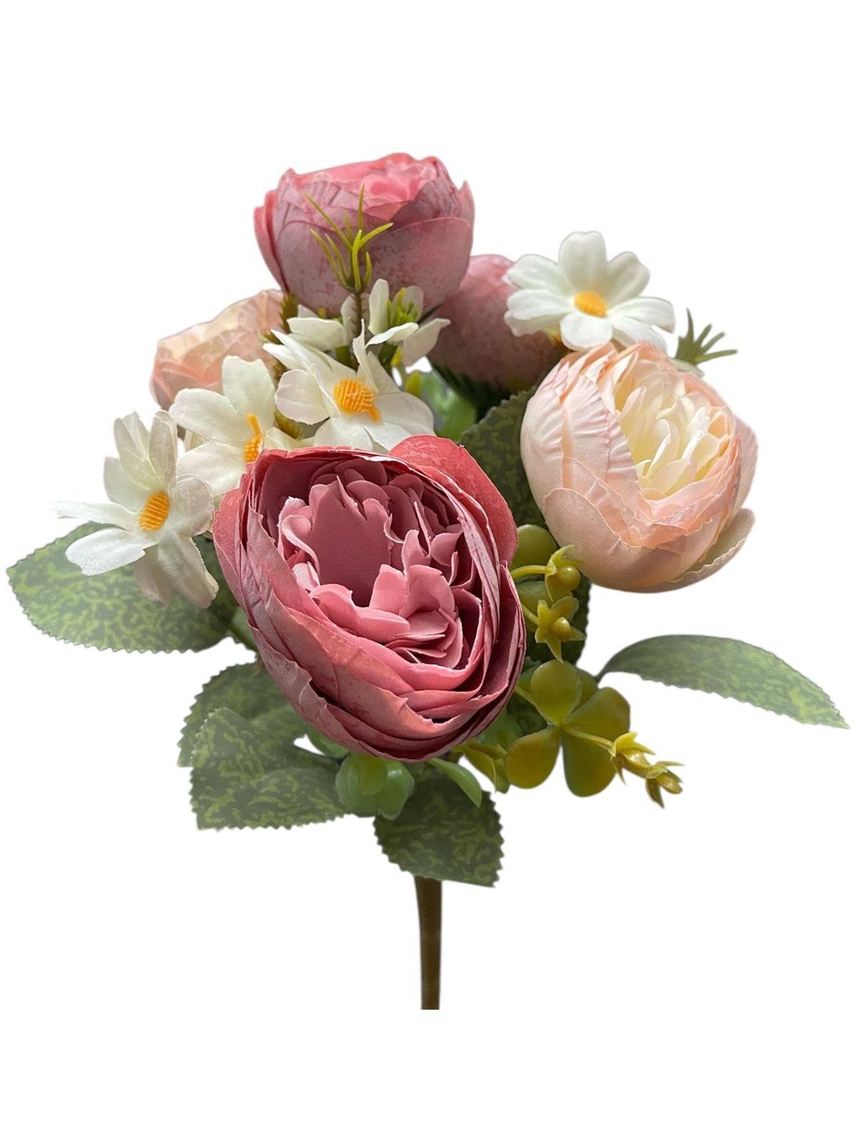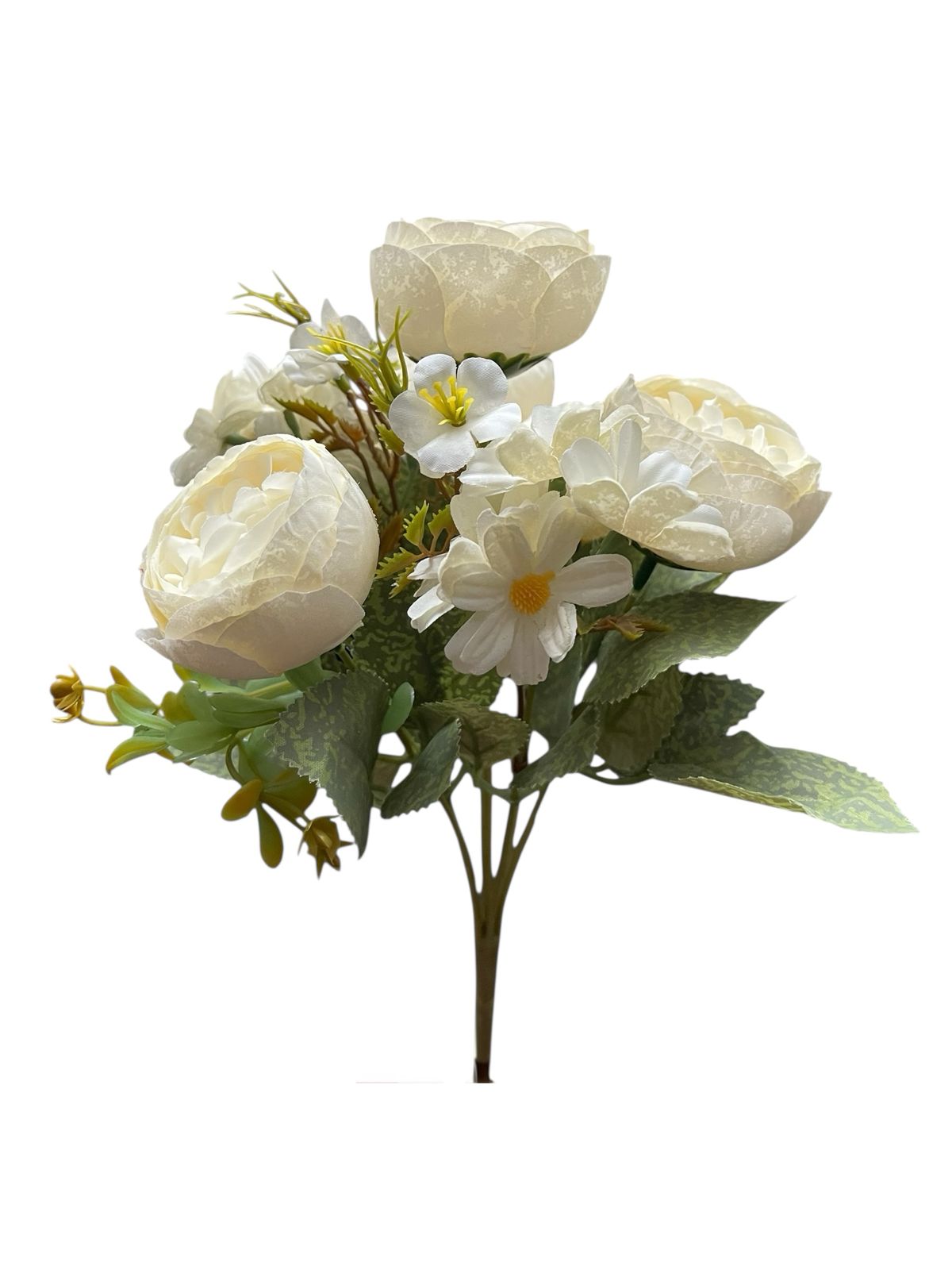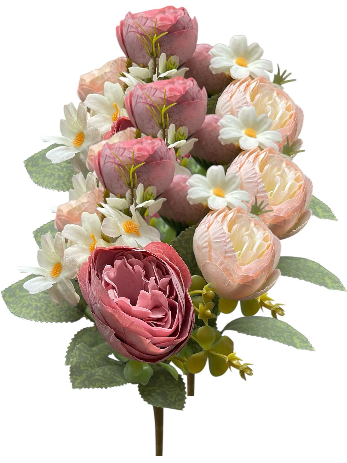 Ramo flores artificiales camelias satinados premium y margaritas decoración hogar y eventos.Medida: 30cm