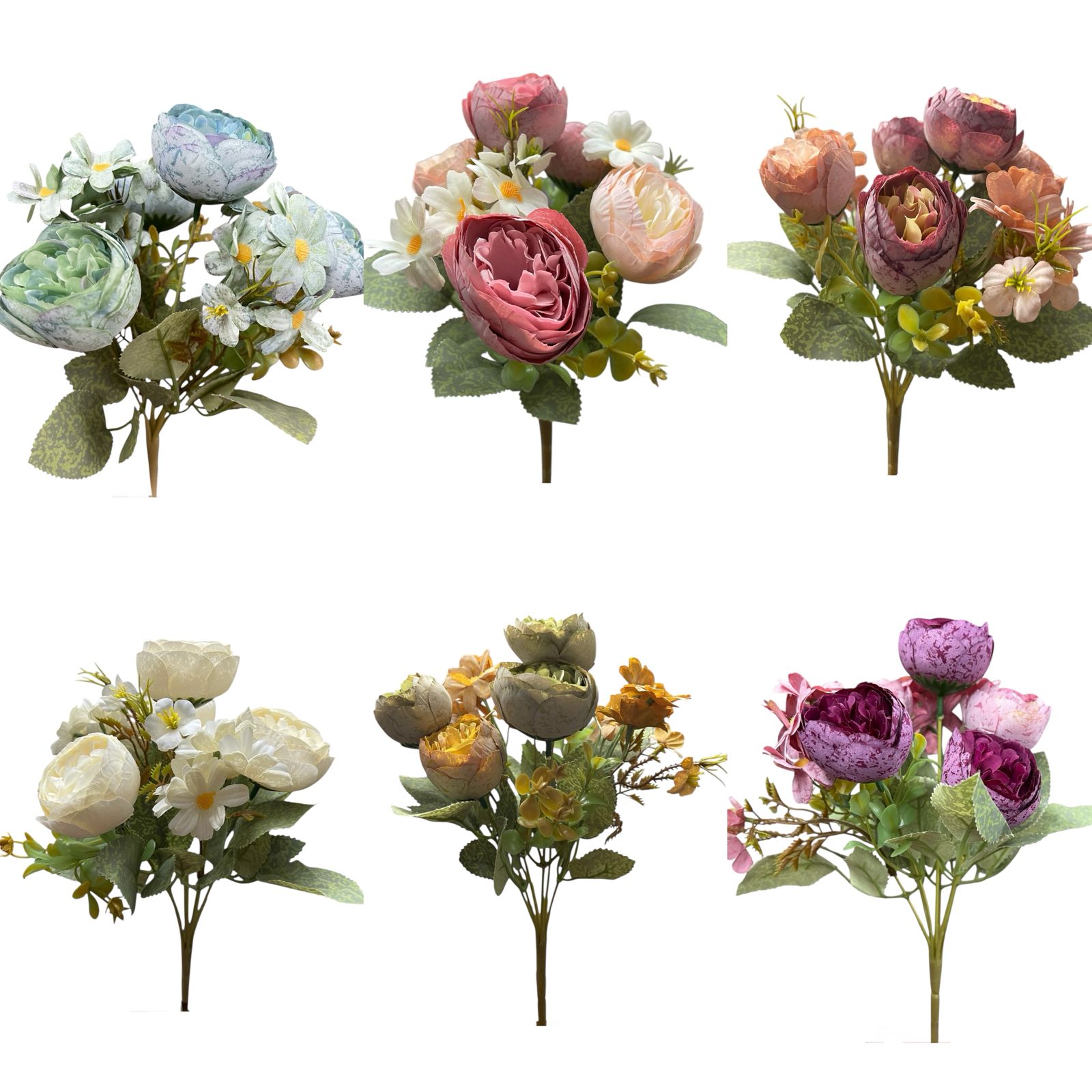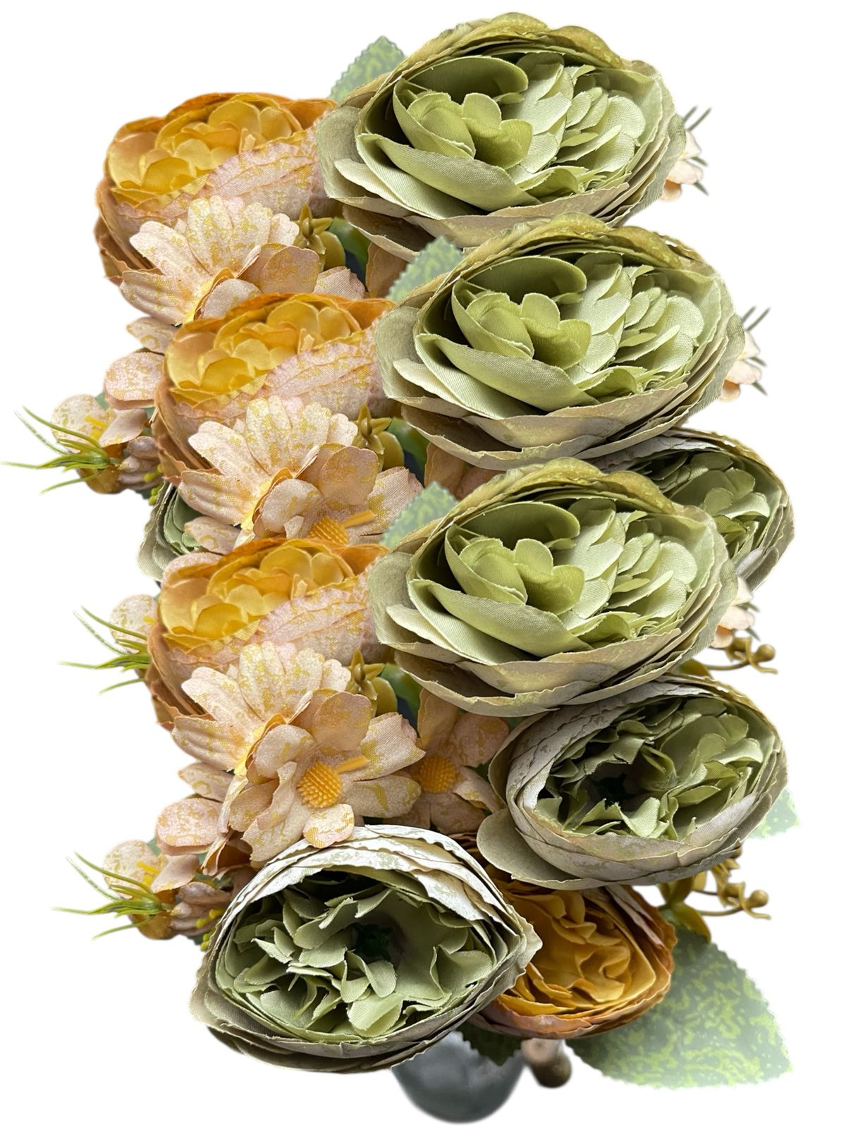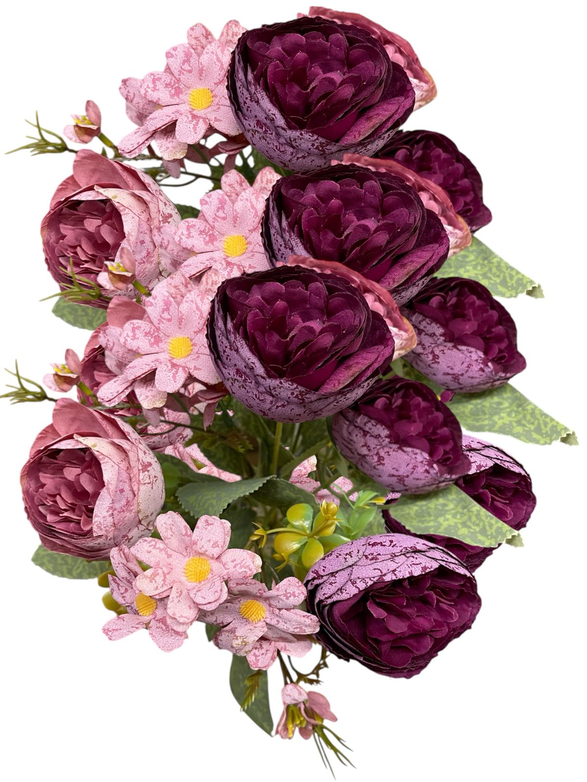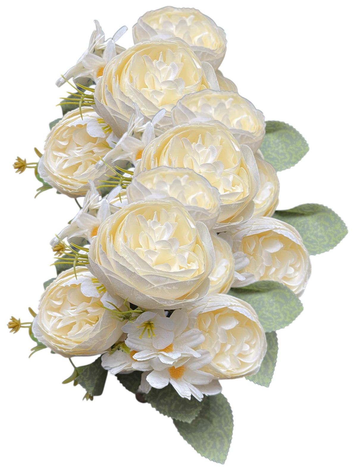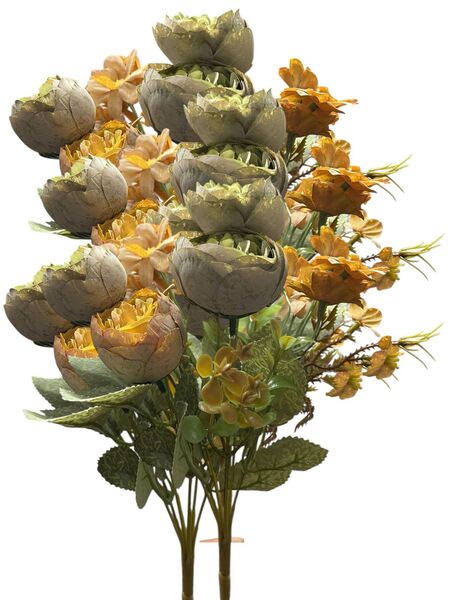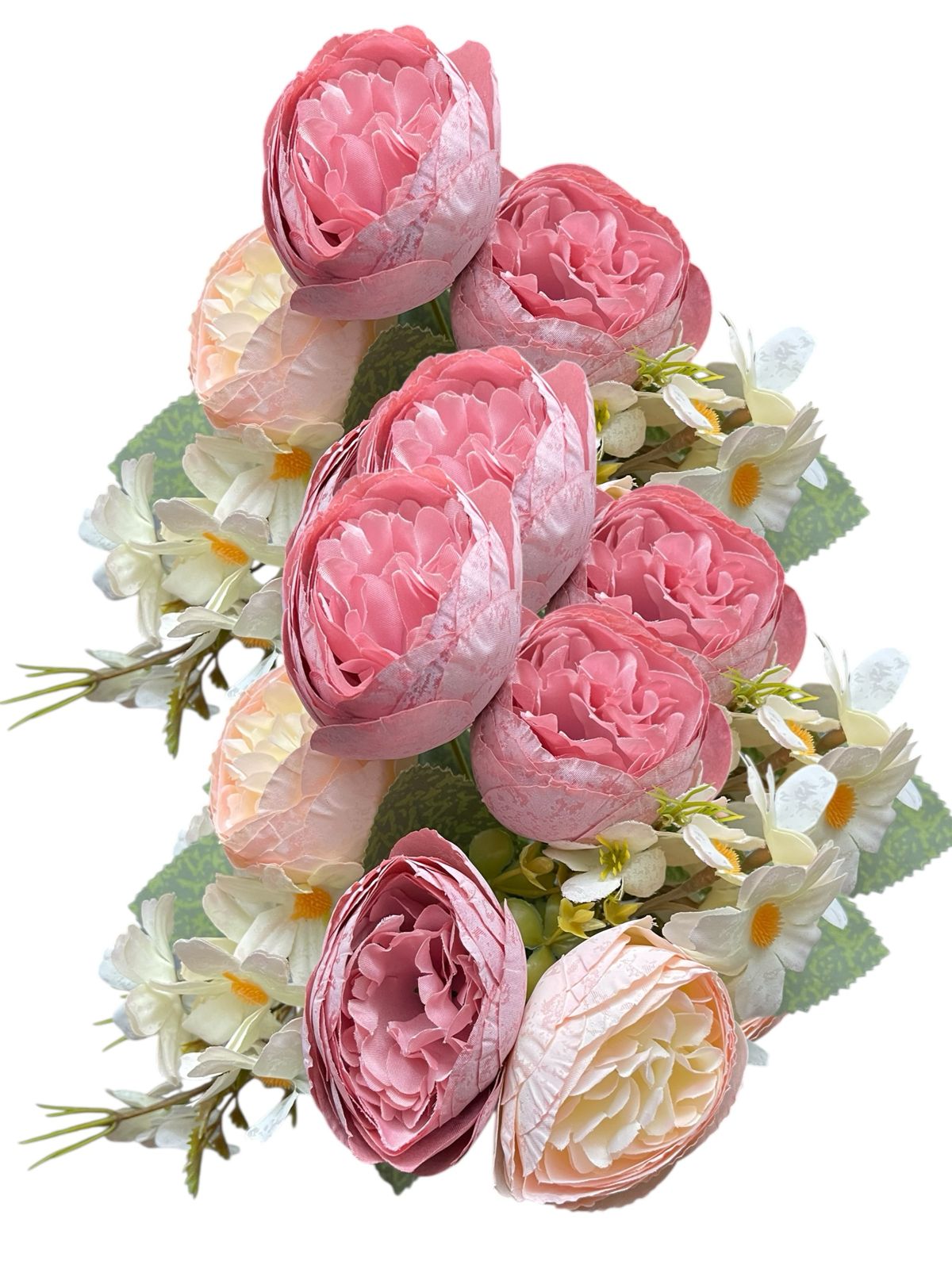 Transforma cualquier espacio con este hermoso ramo de flores artificiales tipo camelia con tela premium y margaritas, ideales para decoración de interiores, eventos, bodas, quinchos, livings, locales y mesas principales.