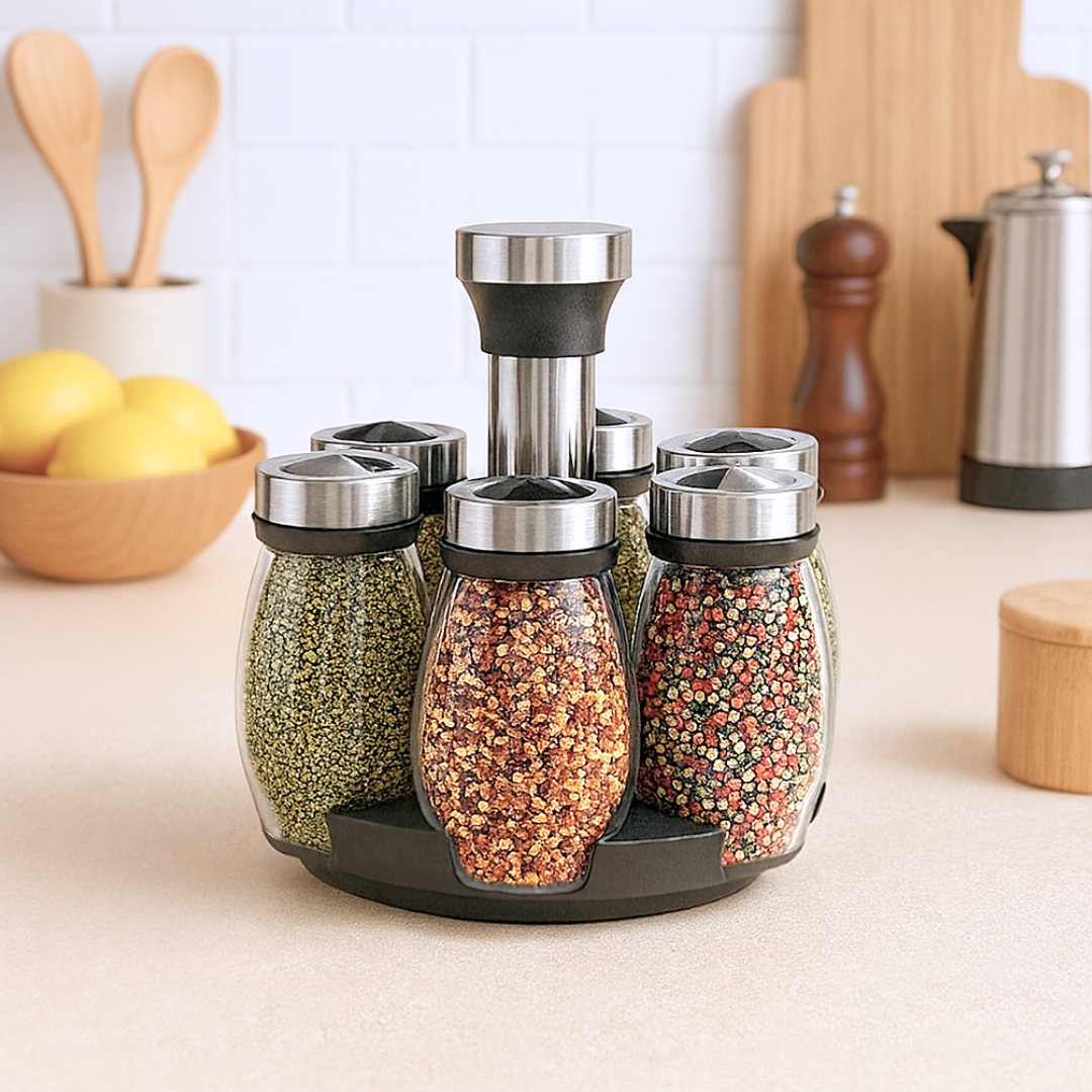 Material: Vidrio, plástico y metal Capacidad especieros: 131 ml Medidas set: 17 cm x 15 cm aprox